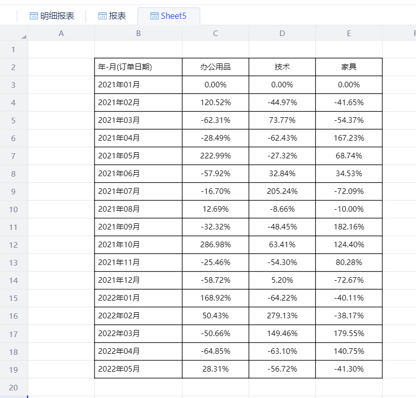 将“类别”设置为分区,“订单日期”设置为寻址,其结果为根据类别划为三个分组,每个分组按月份计算与前一项的差异百分比,如下图所示。
