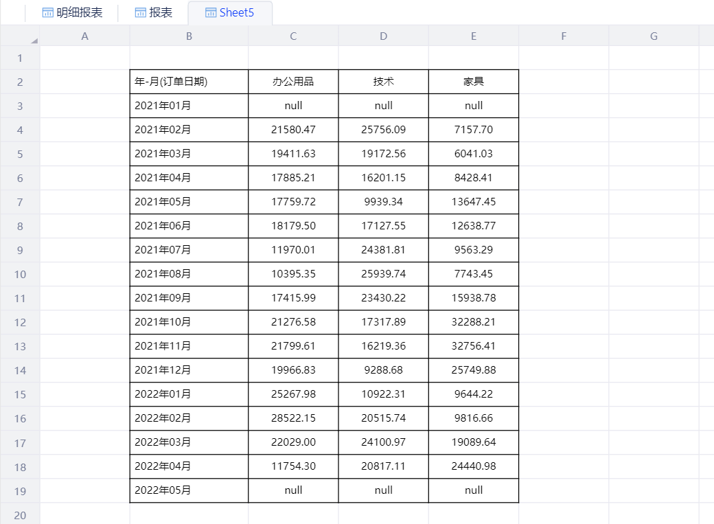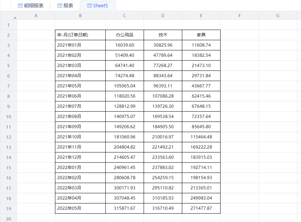 将“类别”设置为分区,“订单日期”设置为寻址,其结果为根据类别划为三个分组,每个分组按月份计算与之前所有项的累计,如下图所示。