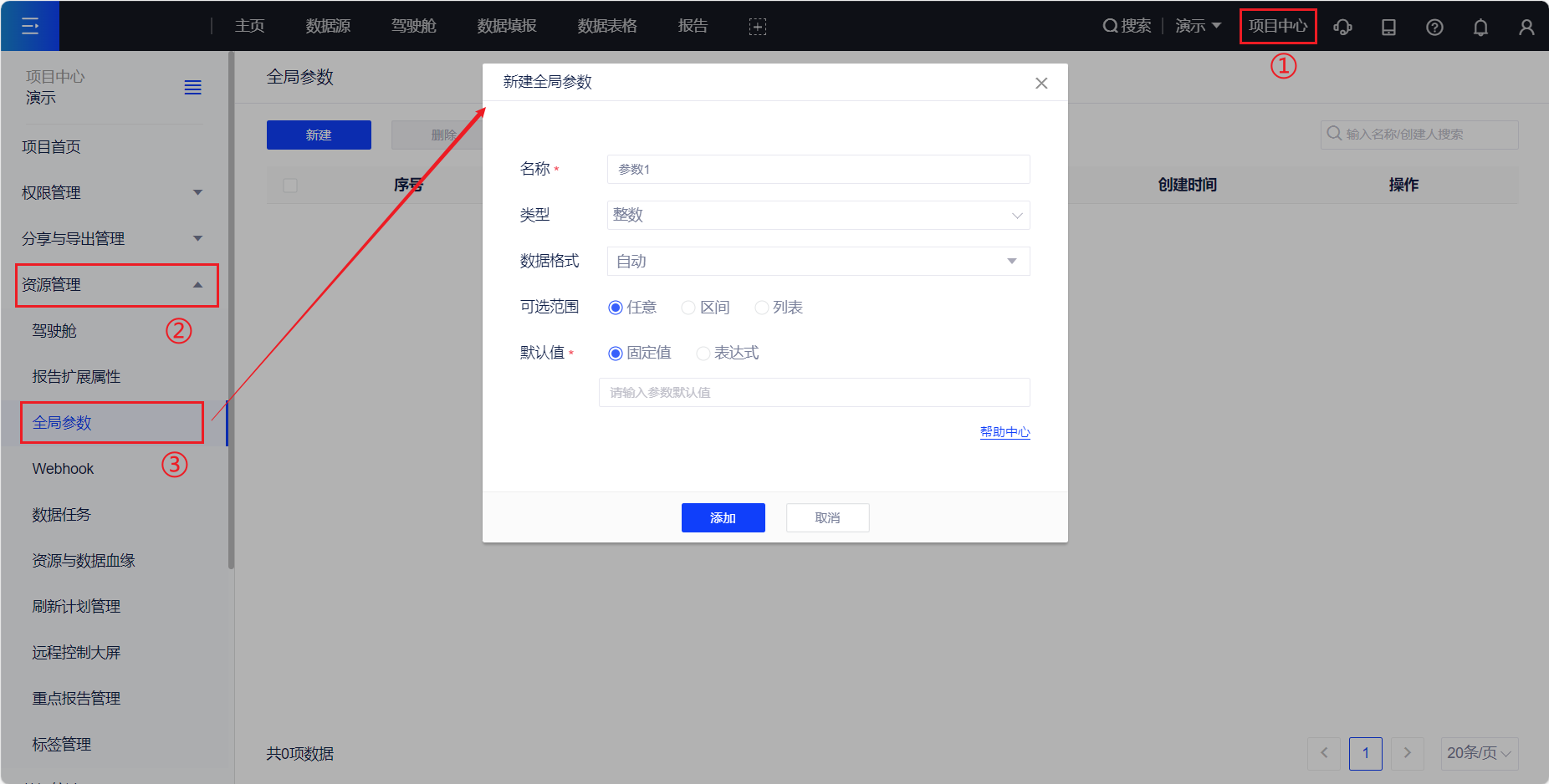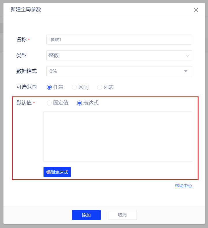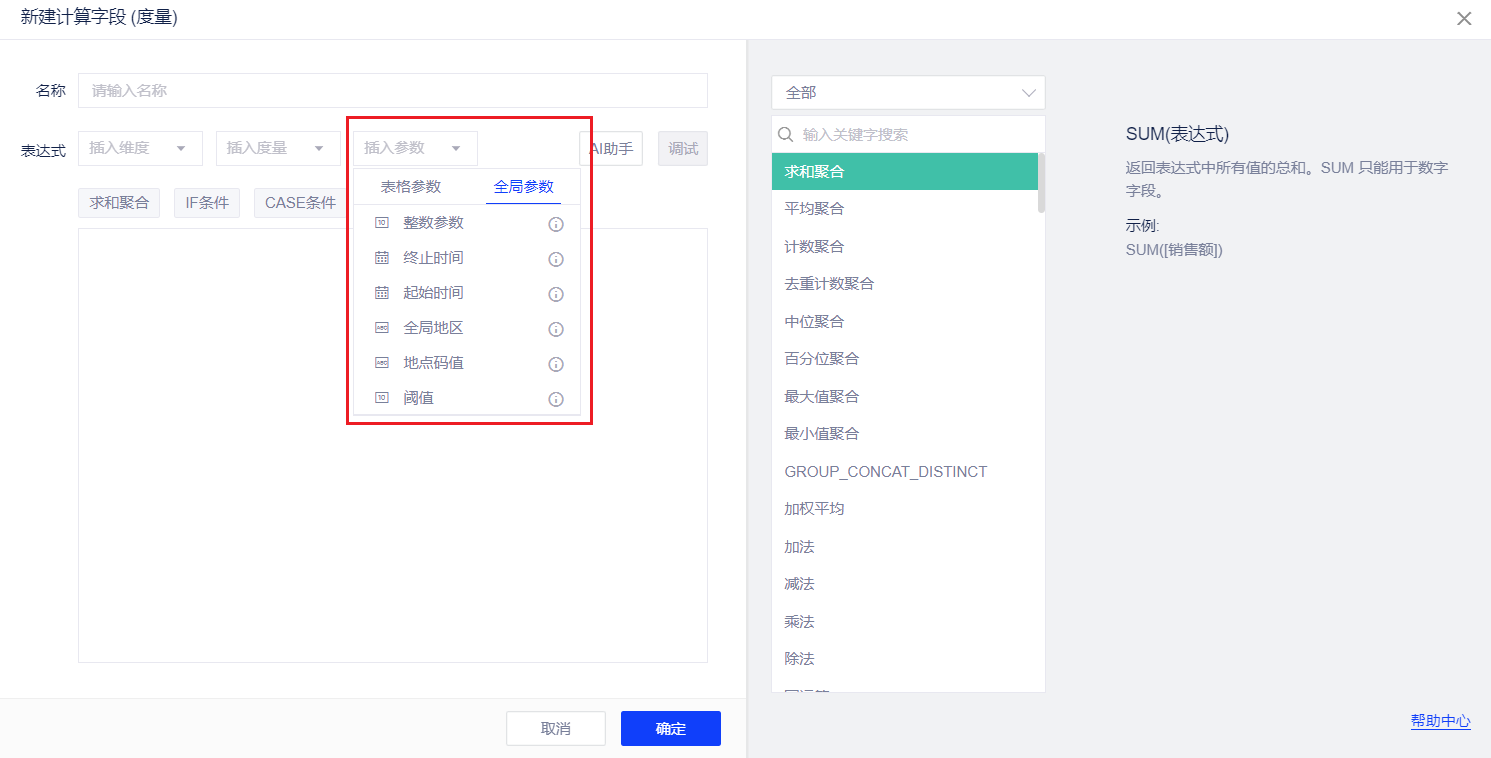 参数也叫做变量,可以在计算字段中使用,实现单个计算字段的动态逻辑方案。当参数取不同的值,字段表达式会对应不同的计算逻辑。参数包括全局参数以及表格参数,全局参数可在所有位置调用,表格参数仅可在对应的数据表格中调用。