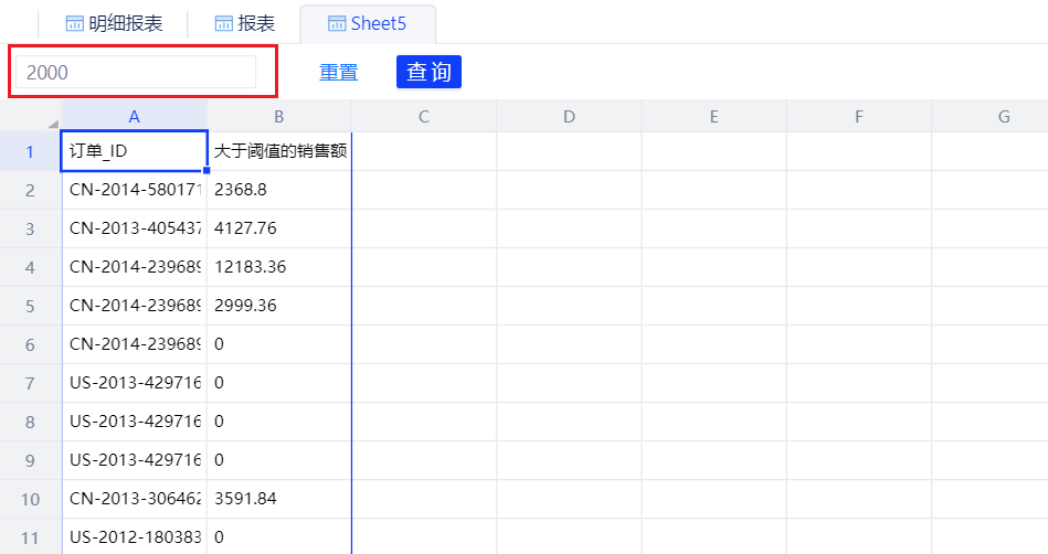 - 在数据表格中,可以计算字段中调用全局参数,此处以一个默认值为500,名称为“阈值”的整数型全局参数为例。