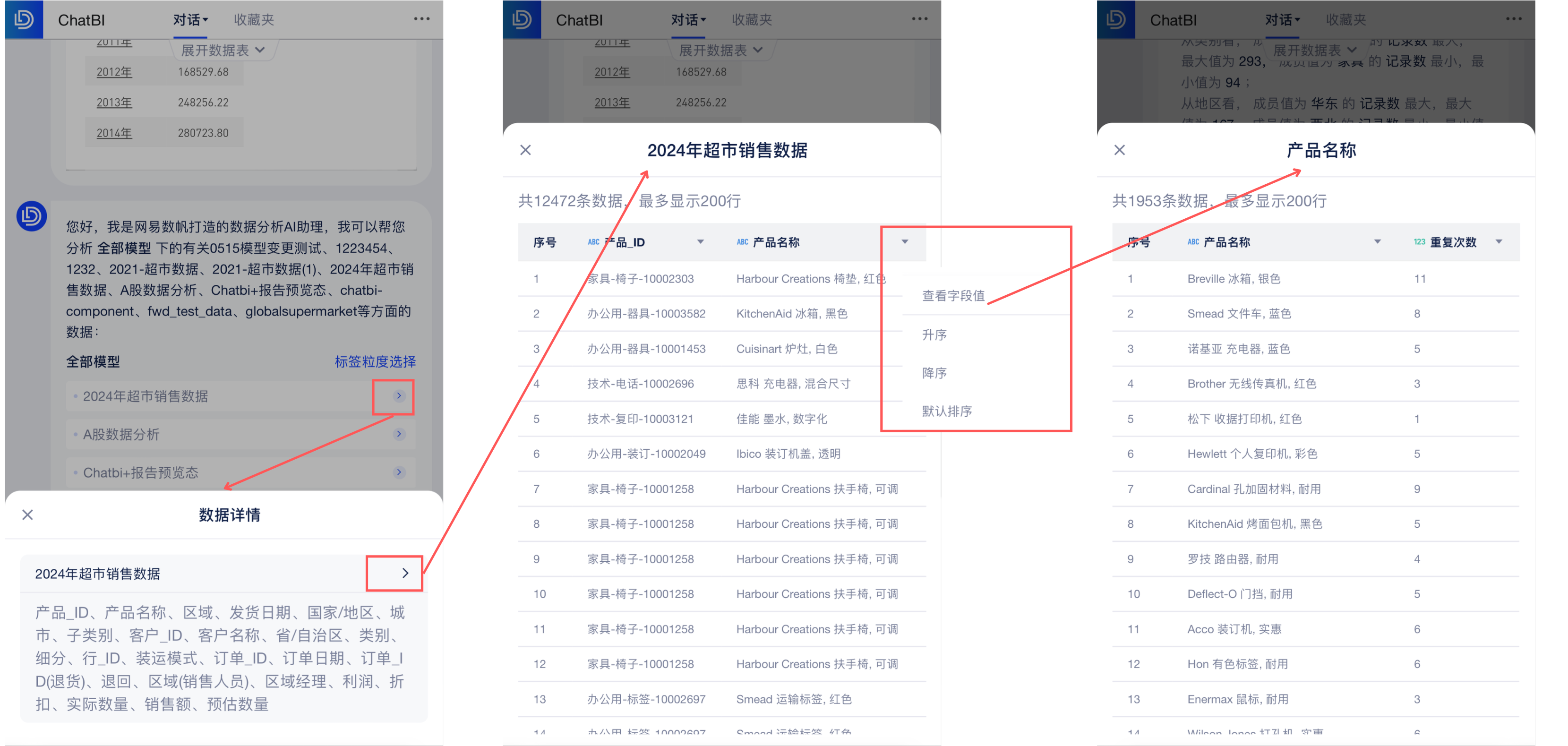 AI助手首先会向你介绍你可以使用的数据表有哪些,并在数据表下方展示六类「提问参考」:算数值、看趋势、查明细、TopN、做比较、同环比。