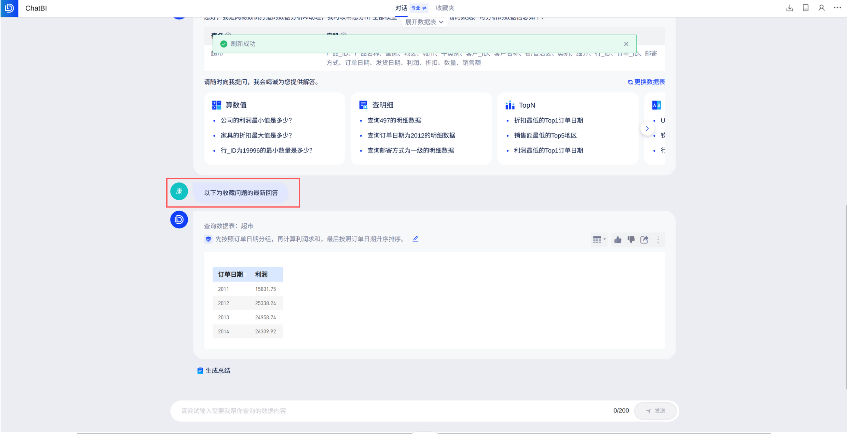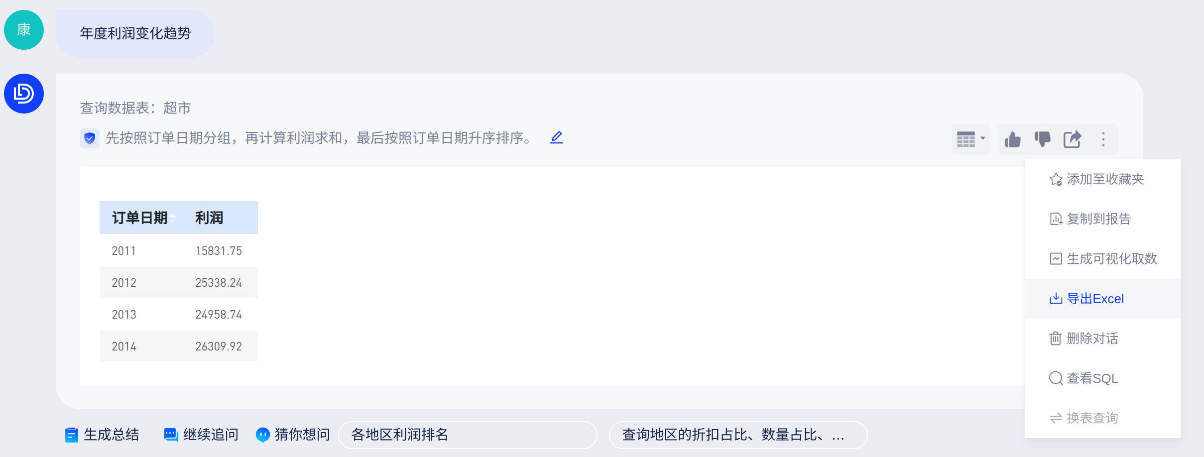 其中点击[再次问答]选项,会打开新ChatBI界面,并展示回答。