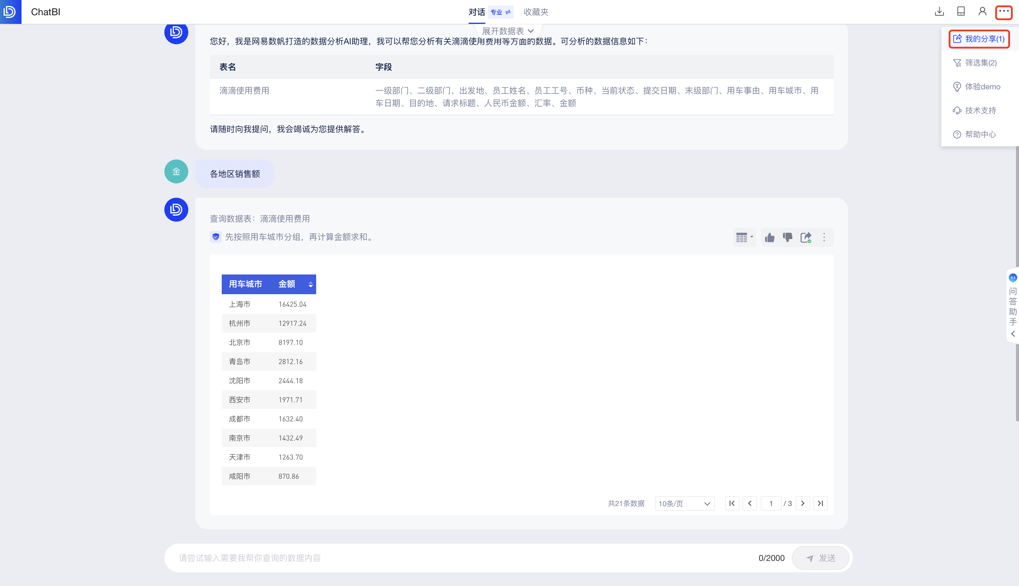 如果你想和其他人共享你通过ChatBI问答得到的结果,可以点击问答右上角的「分享」按钮: