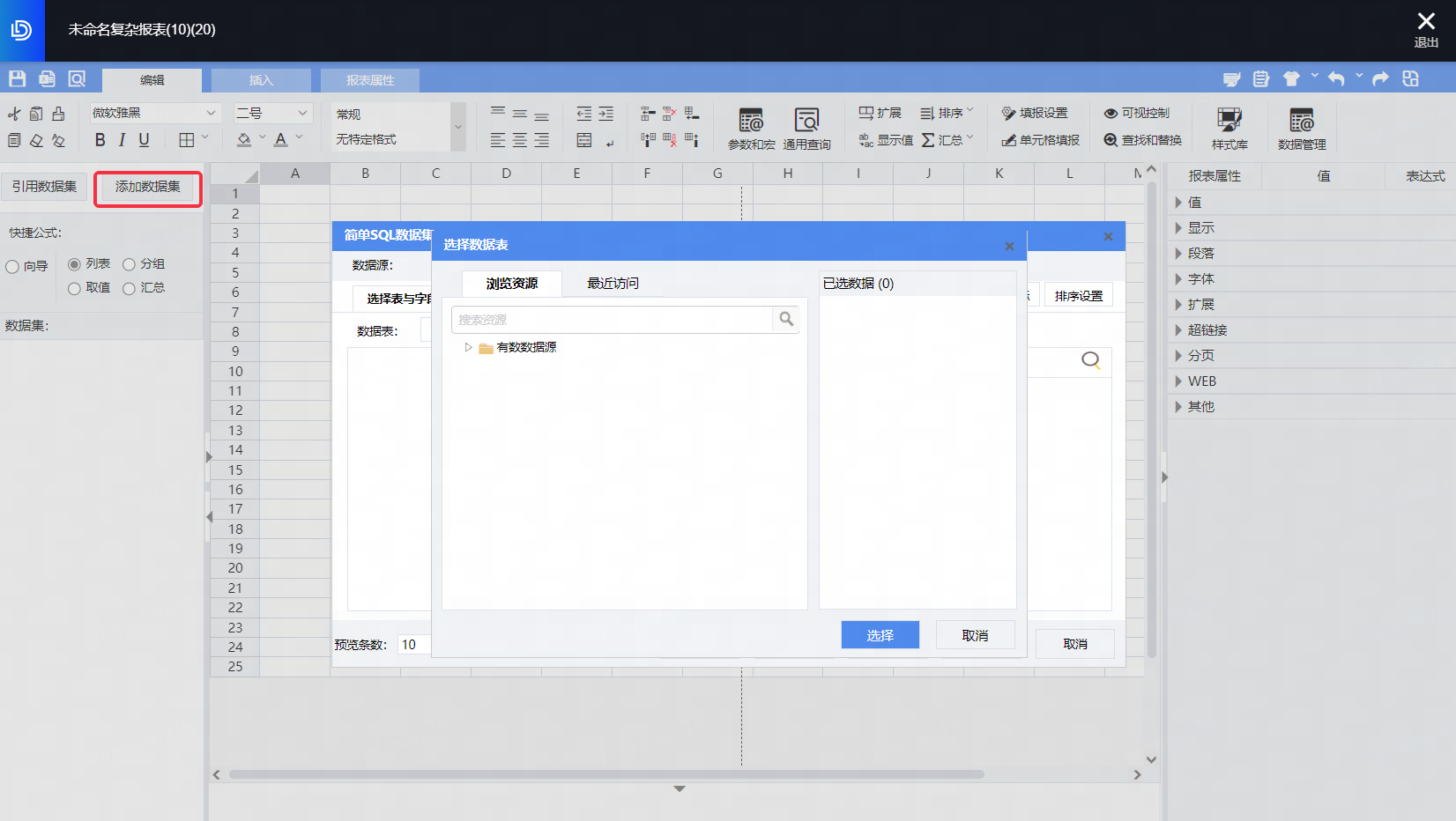进入复杂报表设计器后,点击[添加数据集]按钮,选择[SQL检索],可在弹窗中选择刚才已经同步的数据连接的库及自动登记的表,并选择该表下需要用于复杂报表设计的字段,将该数据集保存为公有(所有用户均可使用)/私有(仅当前用户可用)的数据集: