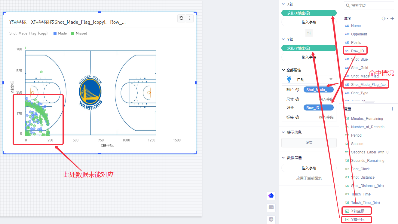 (5)但可以看到,数据点并未显示在图片的正确位置,且字段"Shot_Made_Flag(copy)"的内容需要翻译成中文。需要调整图片的显示位置和设置数据字典。