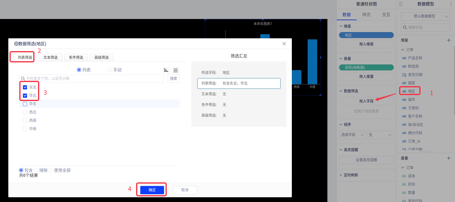 例如,需要看“每个地区的销售额“柱状图的华北和东北地区的销售额变化。将“地区”拖入到数据筛选框中,在弹出的筛选框中选择华北和东北即可。