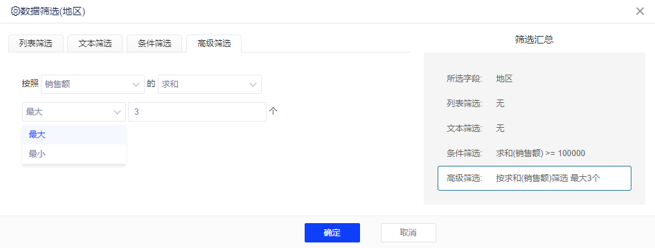 下图意为(地区)按照“销售额”的“求和”,最大3个,指筛选出销售额排名前3的地区。