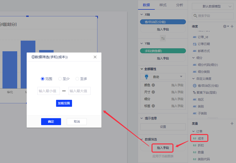 连续筛选:将度量字段“成本”拖入筛选器,将触发连续筛选。