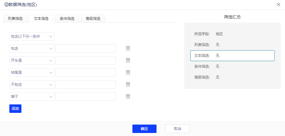 当拖入维度字段时候,数据筛选有列表筛选、文本筛选、条件筛选、高级筛选和时间范围筛选(只在筛选时间时可以使用)。