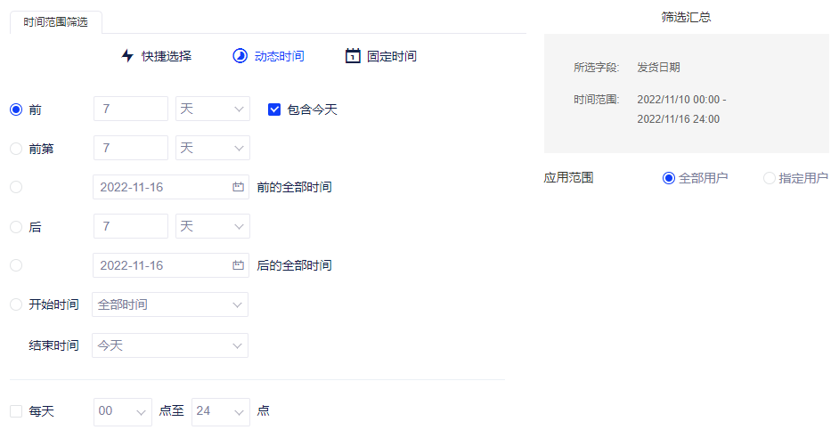 动态时间,日期会动态变化。提供了5种动态时间段:前、前第、后、动态时间段和每天;