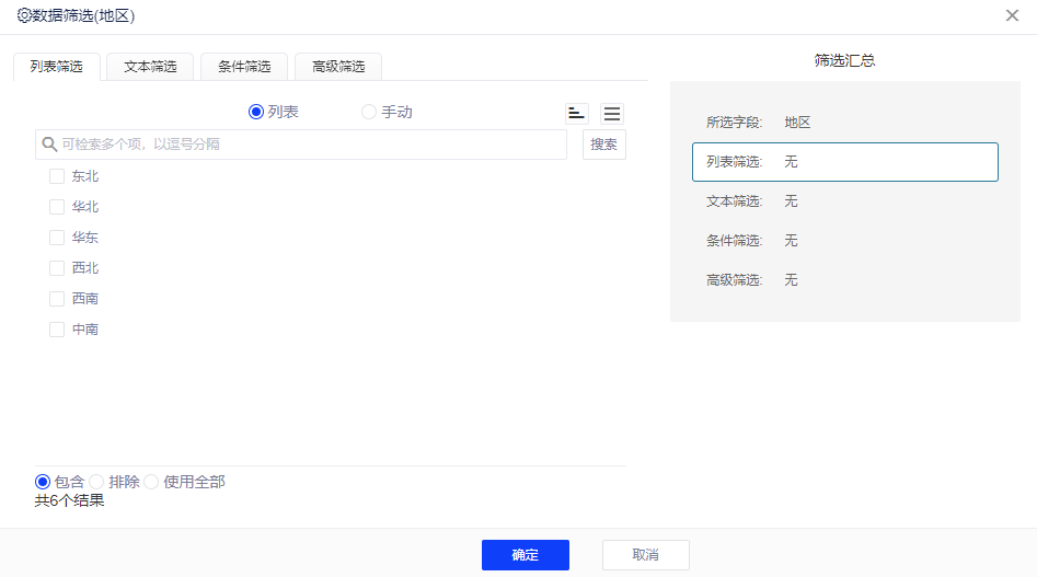 - 手动:指用户输入字段成员名,该匹配是精确匹配,比如用户输入“东”,只会筛选字段成员“东”