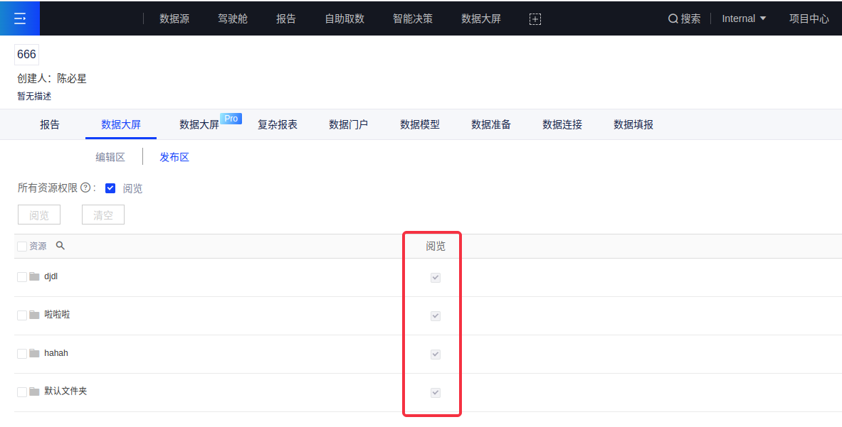 (3)当角色只能查阅的已发布大屏被删除时,再次发布则需要重新给予角色权限。