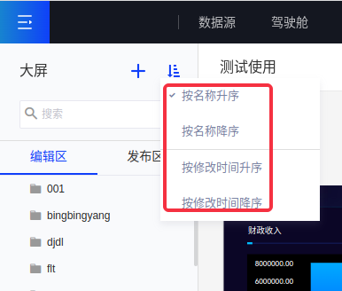 为方便对大屏的管理,产品提供了文件夹管理功能,并按照大屏是否已发布分为编辑区和发布区。