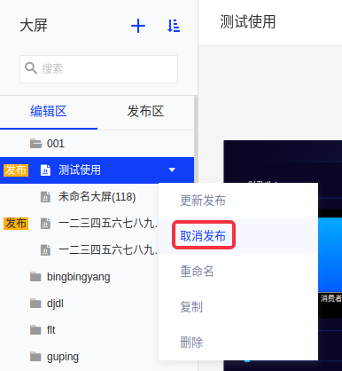 在编辑区右键已发布的大屏,点击“取消发布”即可。