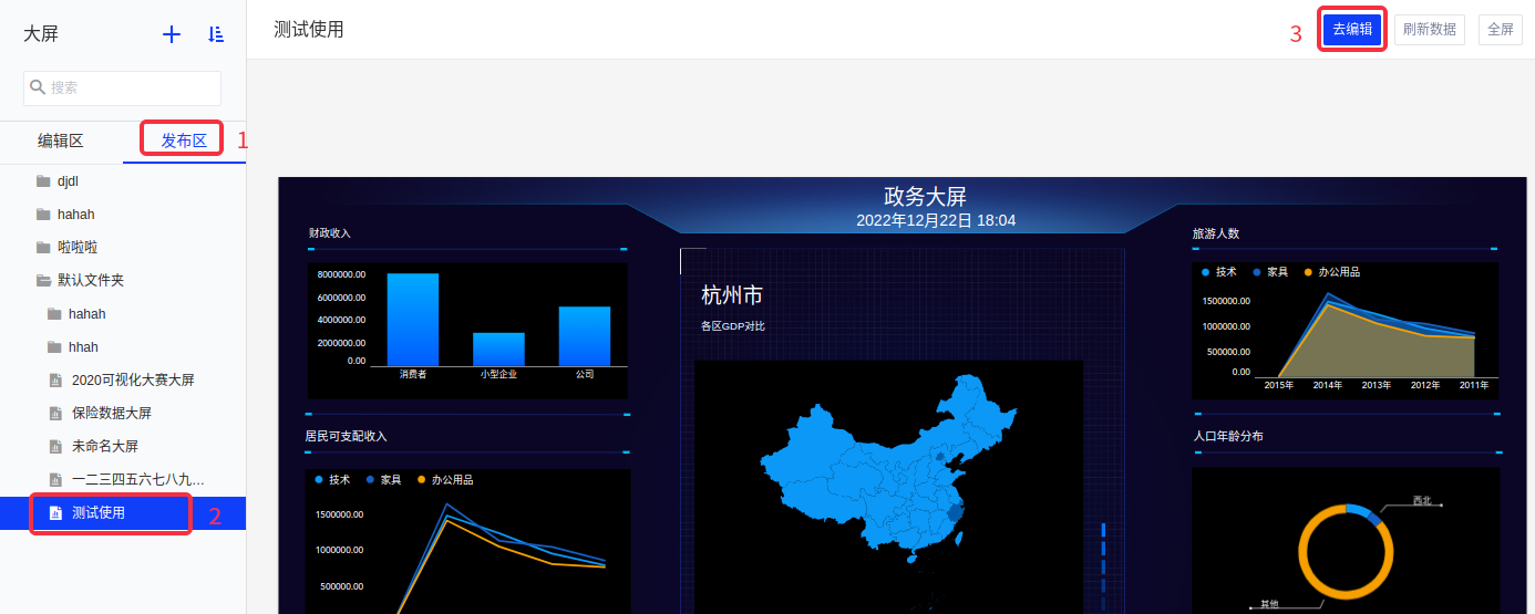 (1)在发布区选择大屏,点击“去编辑”;