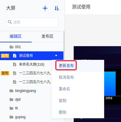 (3)在编辑区右键已发布的大屏,点击“更新发布”即可。