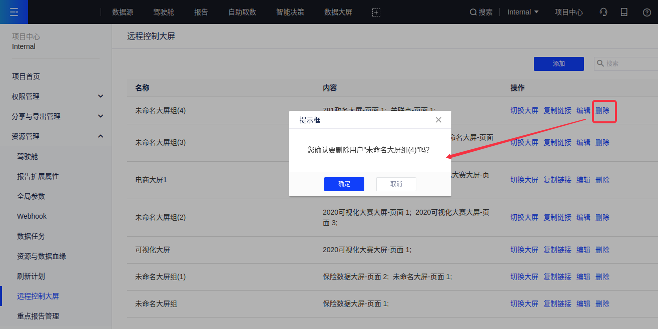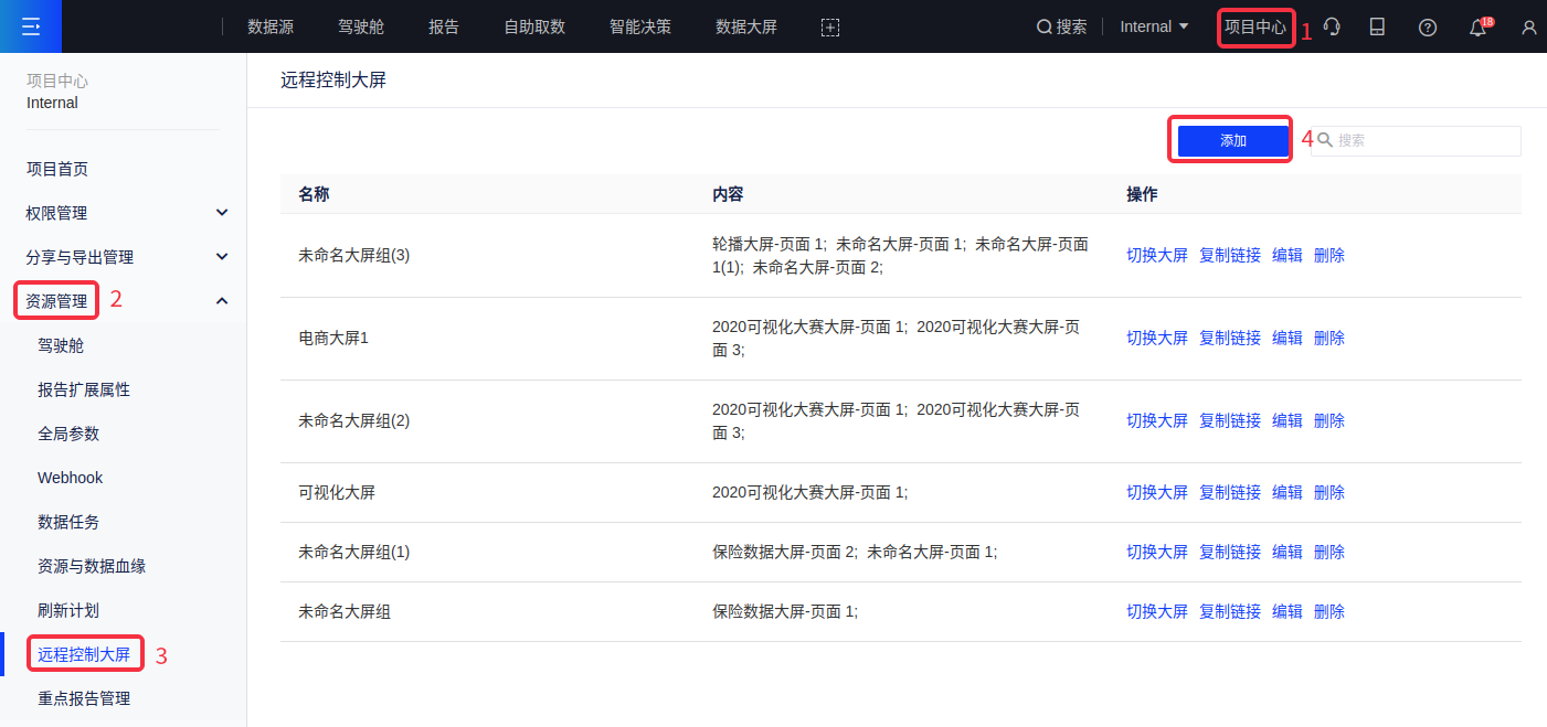 (1)在项目中心中,依次点击[资源管理-远程控制大屏],然后点击“添加”按钮;