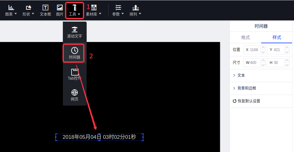 (1)选择“工具”控件,然后点击“时间器”,时间器默认显示为当前时间;