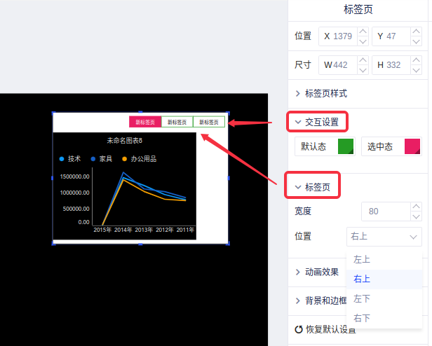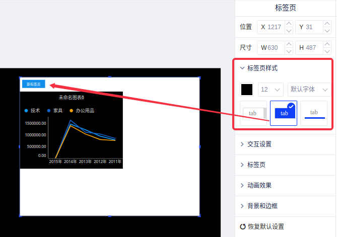 (2)拖动或者在控制区更改TAB控件的标签页样式、颜色、标签大小、字体大小、位置和宽度,设置动画时长、选中状态等;