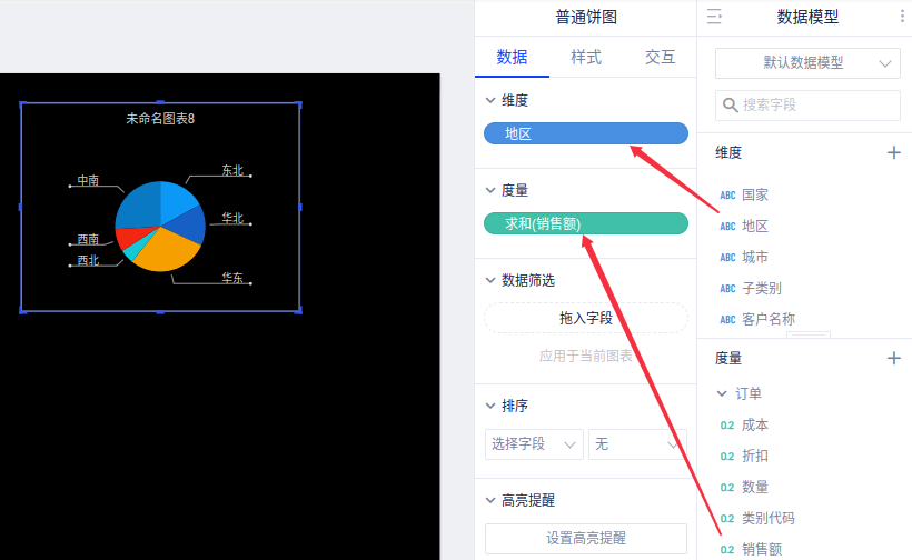 例如,我们需要查看“每个地区的销售额占比”饼图,将涉及到2个字段:维度“地区”,度量“销售额”。