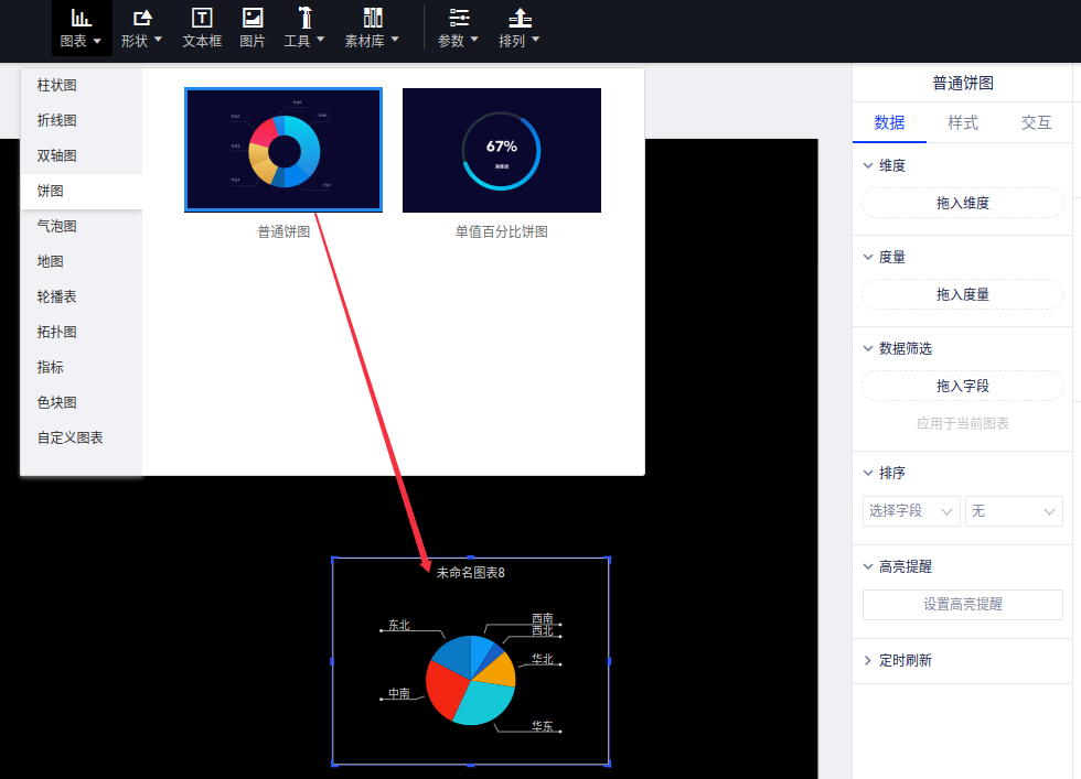 (1)选择“图表”控件,找到“普通饼图”并添加到画布中;
