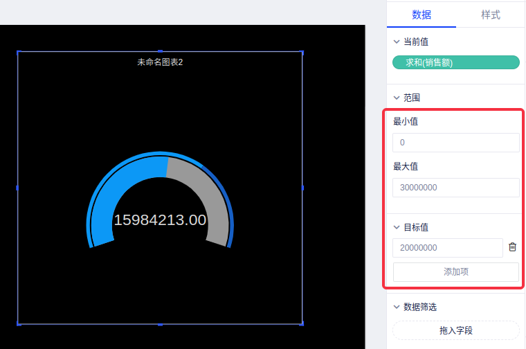 (2)在图表的数据面板中拖入度量;然后设置仪表图中的范围、目标值等,一个仪表图就生成完毕了。