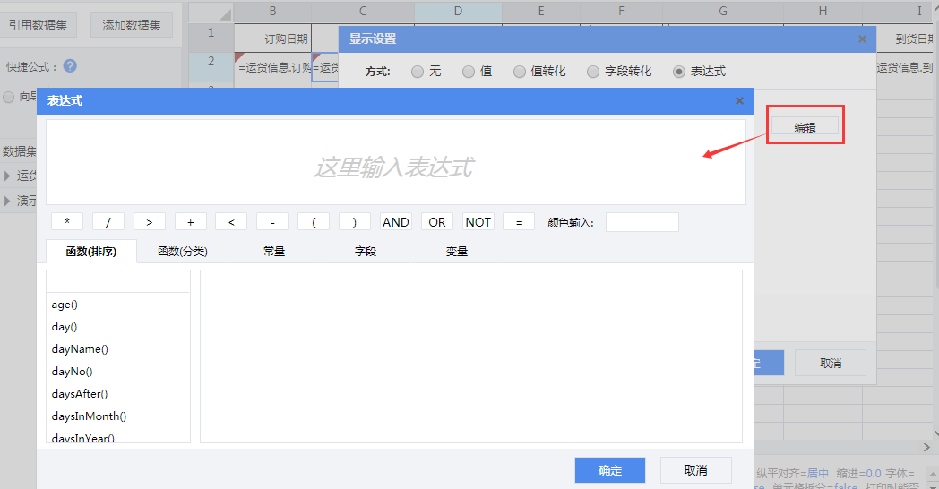 2.选中C2单元格,上方菜单栏选择[编辑]--[显示值],选择表达式,在输入框内直接输入表达式,或者点击[编辑]按钮,进入表达式设置页面设置表达式。