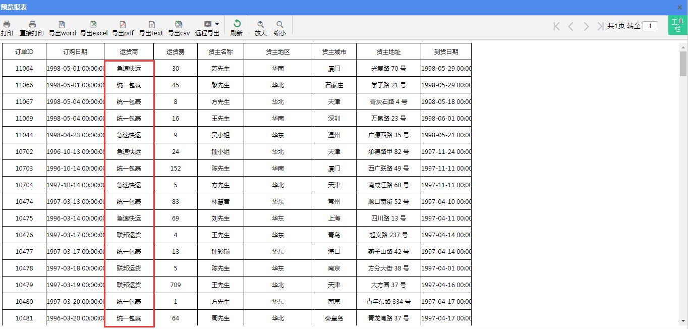 在原始数据表中,保存的是编码性质的数据,而在数据呈现时,需要显示的是有意义的实际值。如数据库的订单表中只有运货商ID,希望将报表中的运货商ID显示为对应的运货商名称,如下图所示: