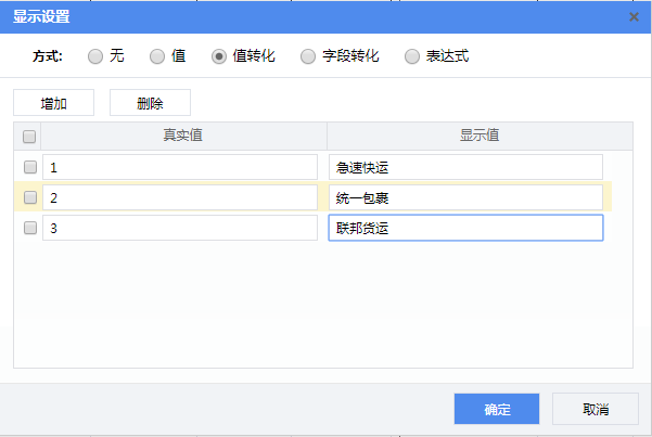 - 值转化:设置真实值和显示值的对应关系,例如运货商ID,"1"显示为"急速快运";"2"显示为"统一包裹"。设置界面如下图: