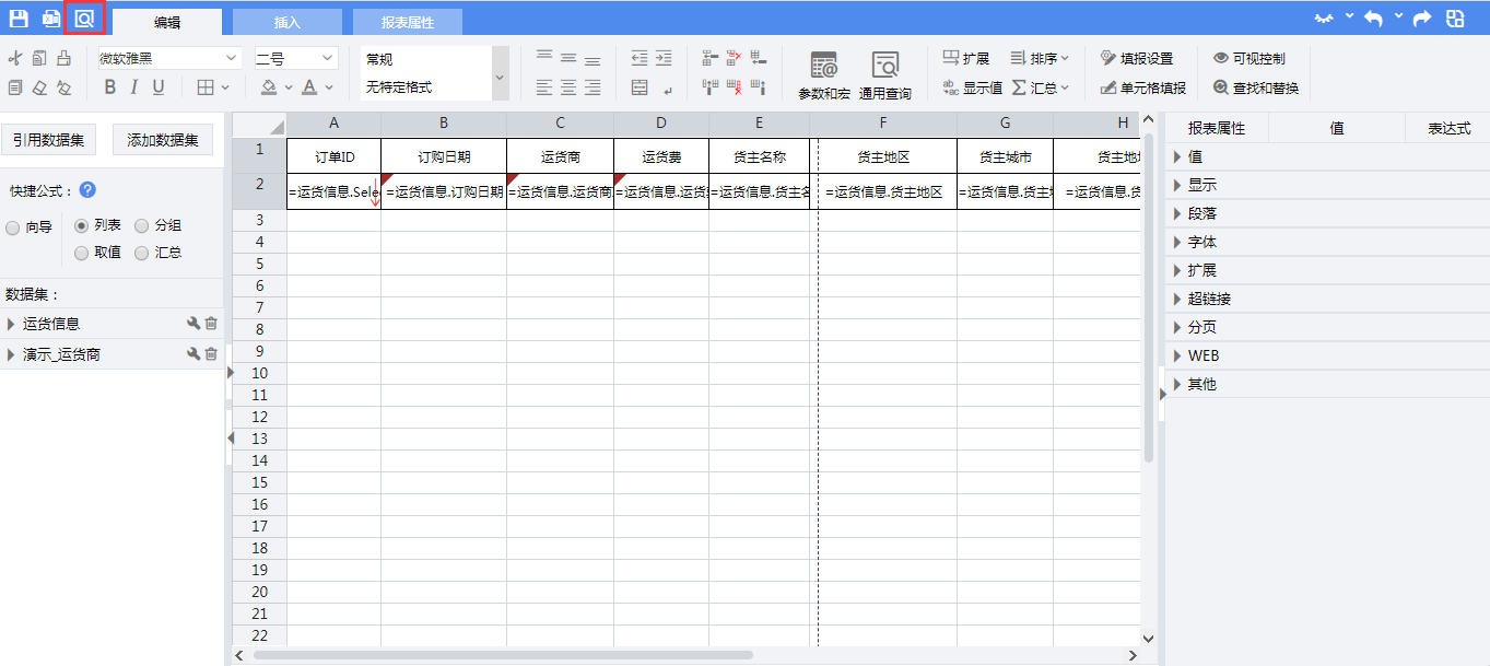 点击设计界面左上角的预览按钮对报表模板进行查看。
