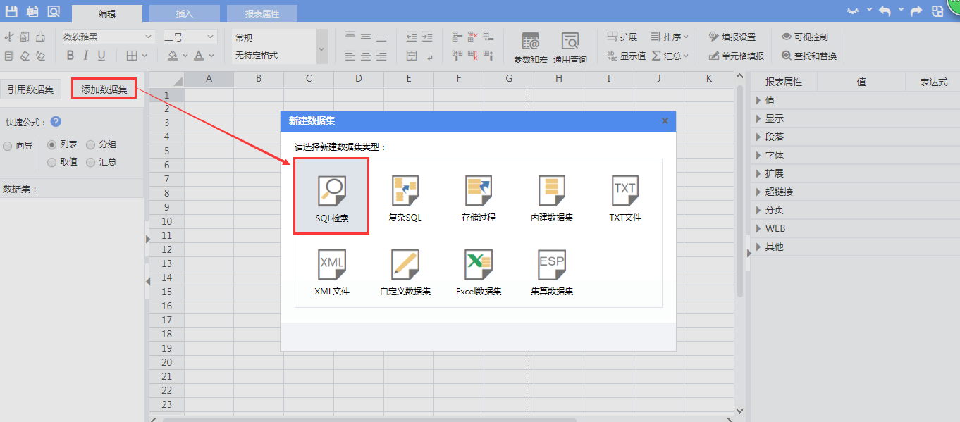 点击[添加数据集]按钮,在新建数据集页面选择[SQL检索]