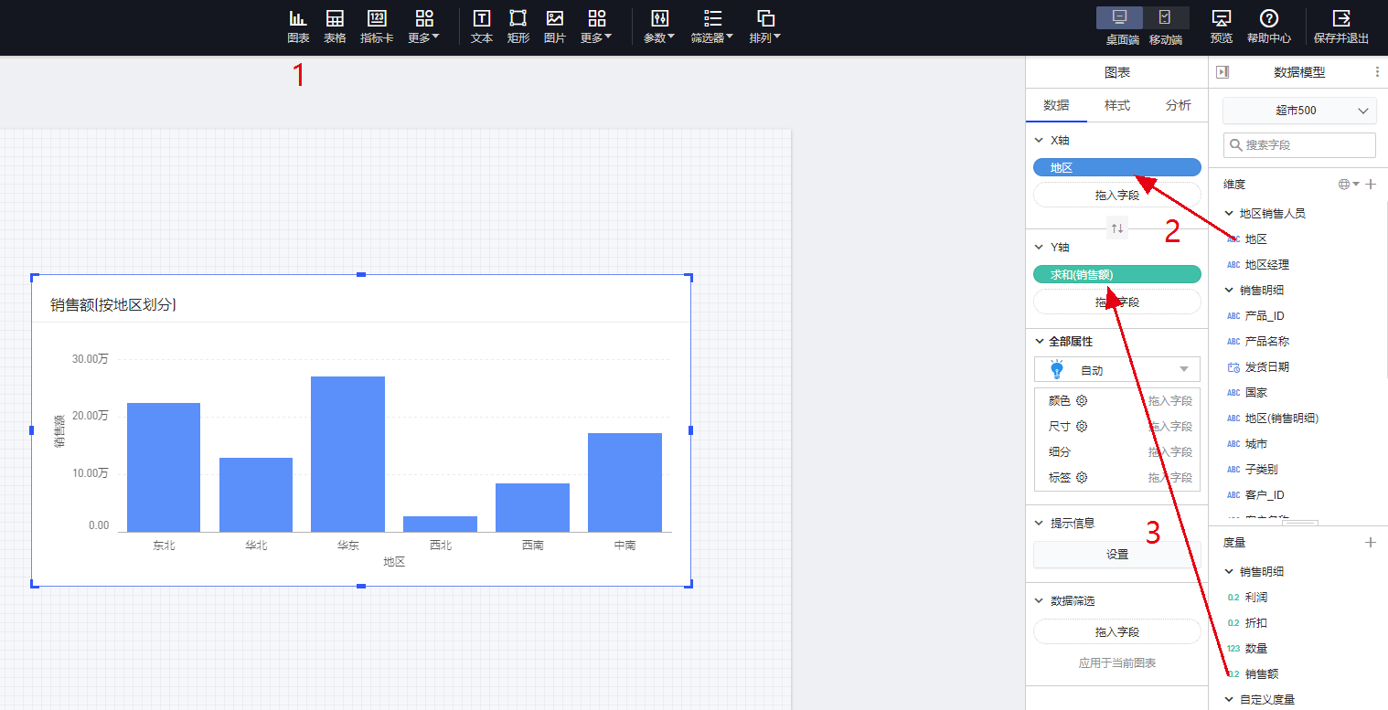 编辑报告:为了展示各个地区的销售额,将“地区”拖入X轴,“销售额”拖入y轴,系统会为您自动生成一张柱形图