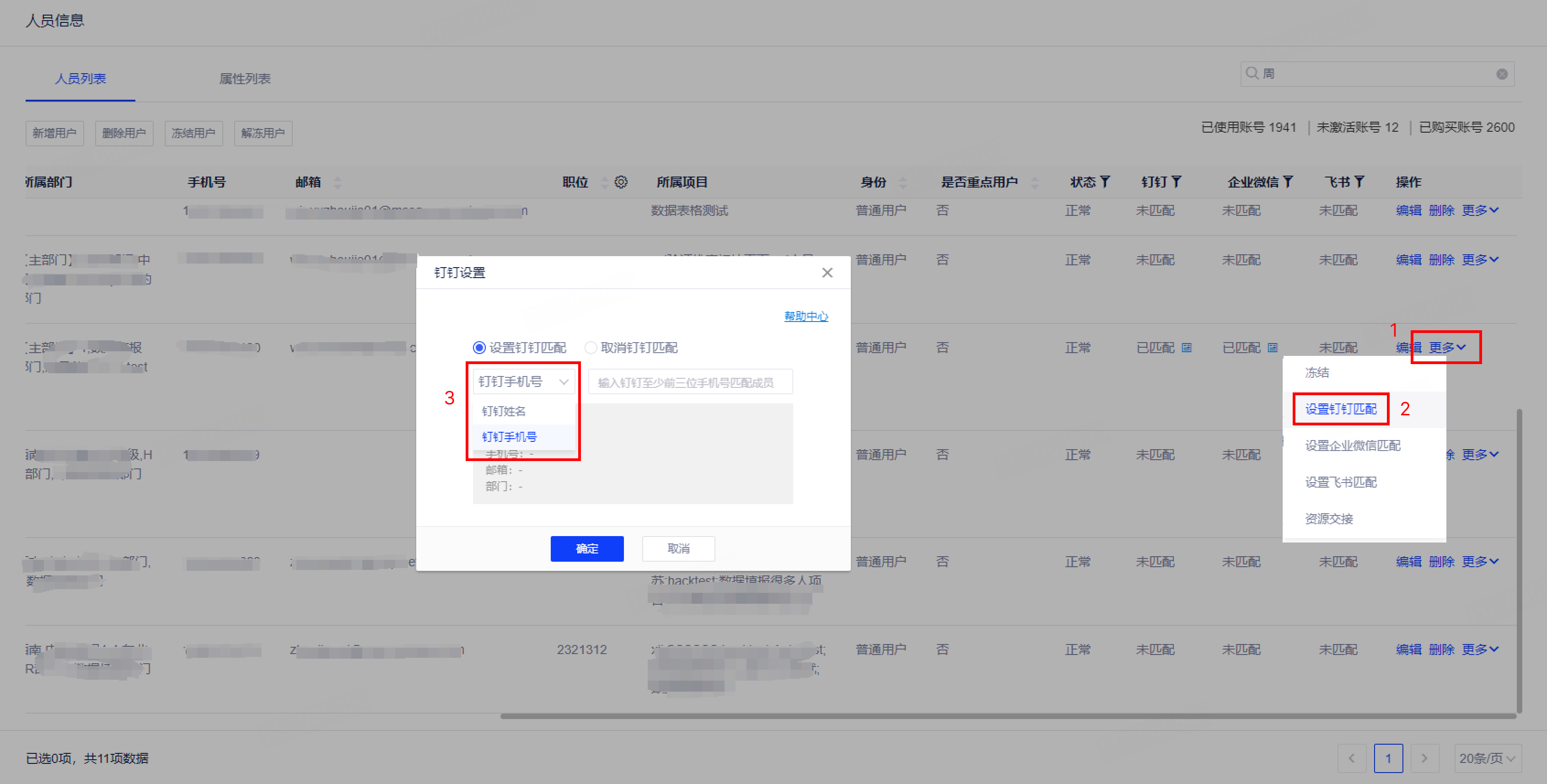 对于部分用户,管理员可手动【设置钉钉匹配】,通过钉钉用户的手机号或者姓名与用户进行匹配,匹配完成后的用户可以直接在钉钉端免密登录小程序。