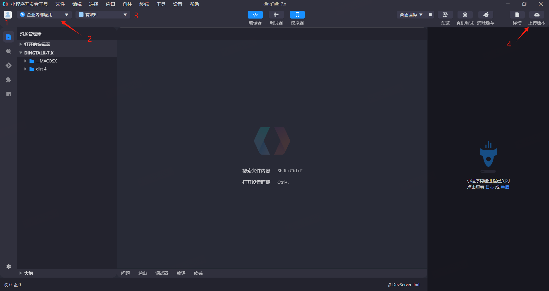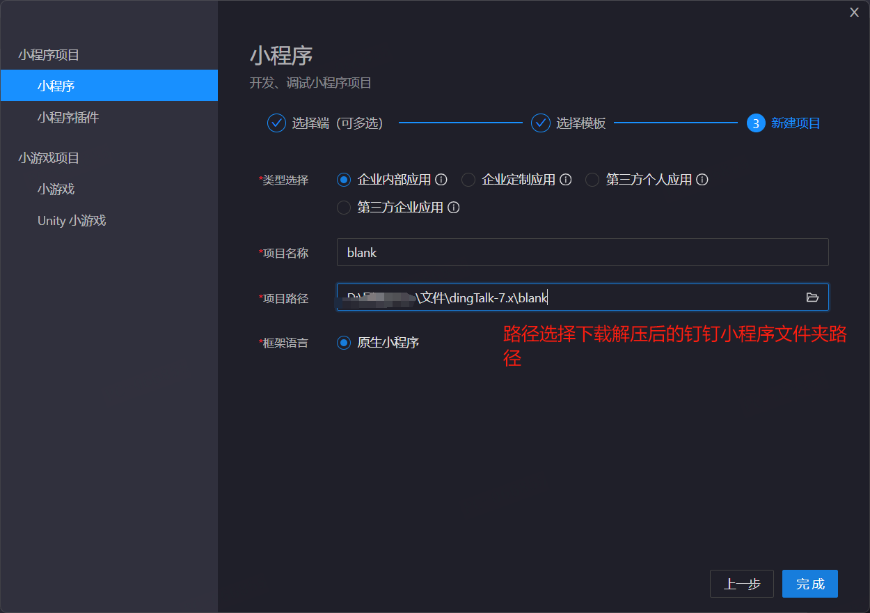 (2)选择钉钉-企业内部应用,路径选择有数小程序代码文件夹,进入小程序发开界面。