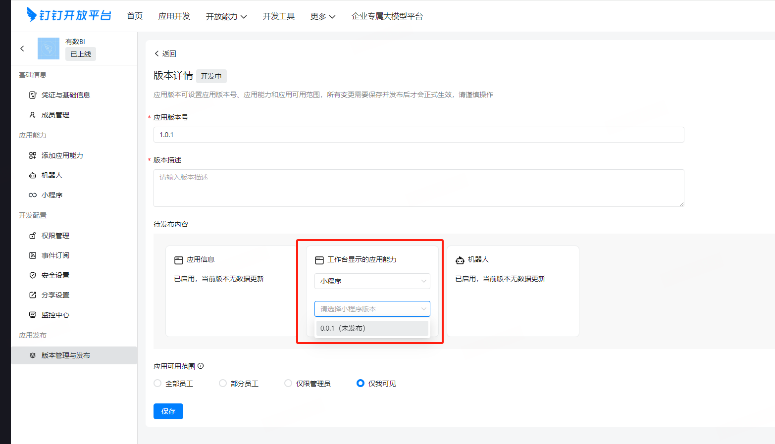 (3)使用钉钉管理员账号登录,并关联之前创建好的应用,上传小程序版本。