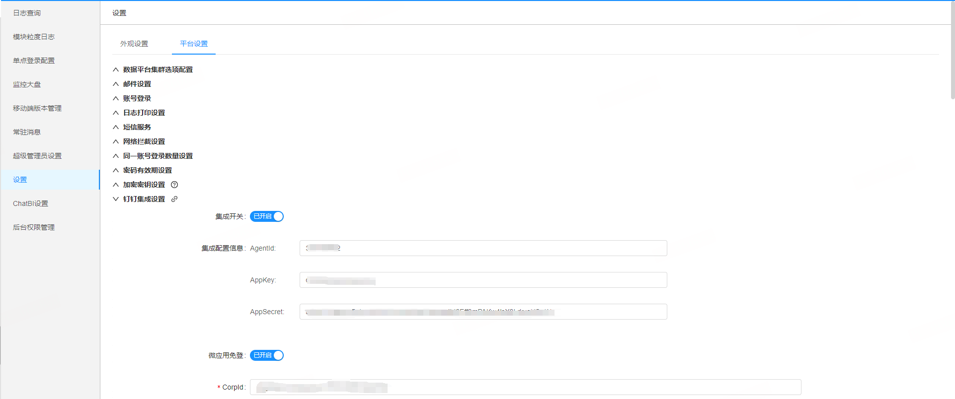 在产品管理后台的设置页面,可以对钉钉集成的开启进行控制。若要在钉钉中启用小程序,首先在【钉钉集成设置】下打开集成开关,其次填写正确的配置信息:钉钉开发者后台提供的AgentId、AppKey、AppSecret。若开启微应用免登,需写入corpID(预警推送使用)。