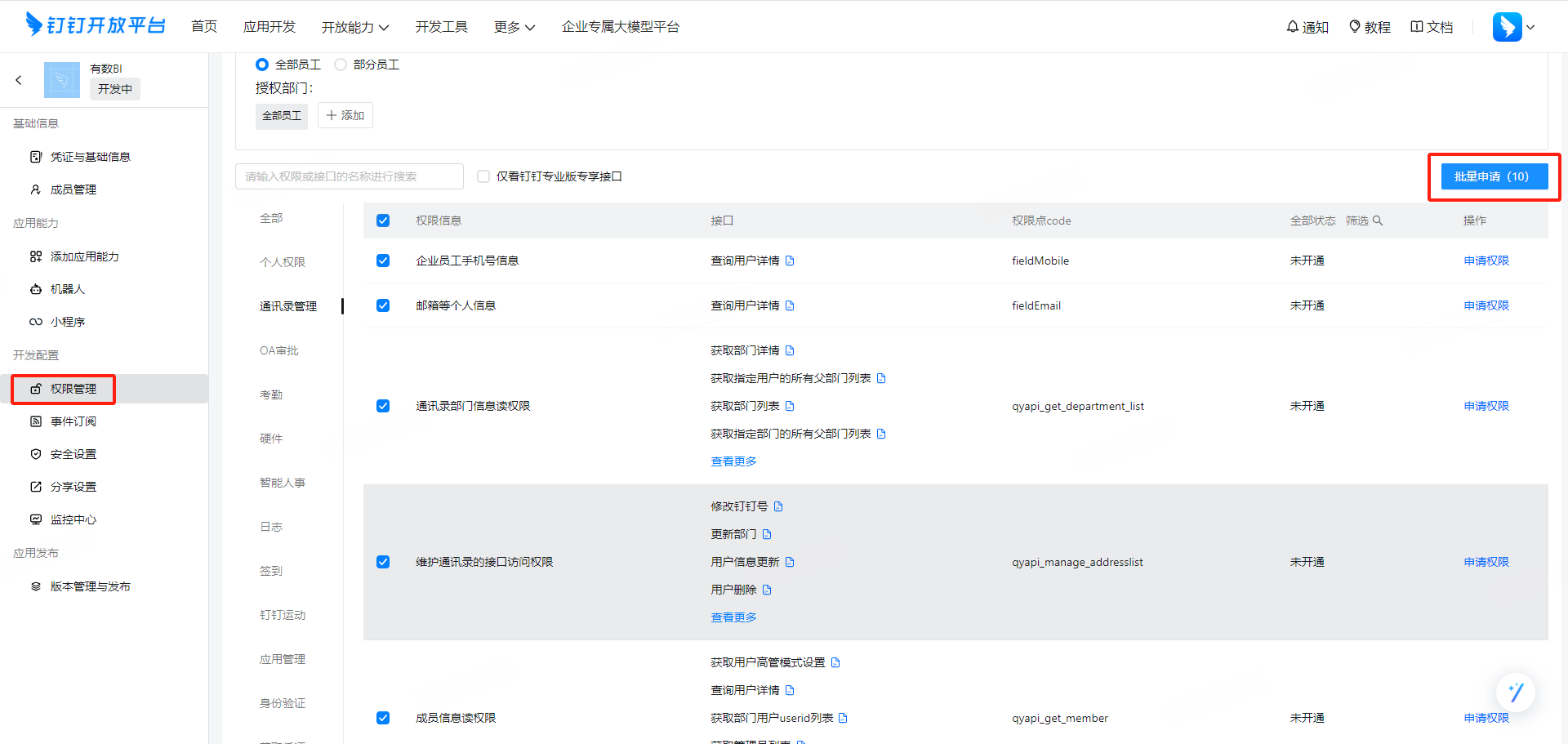 (3)接口权限。为了保证小程序的正常登录及其他功能,必须在权限管理页下申请开通企业通讯录权限。