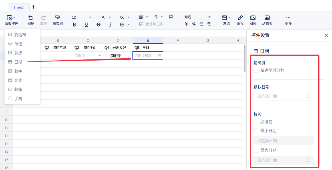 如果您需要搜集日期类型的数据时可选用“日期”控件,在控件配置区可以精确至时分秒、默认日期和校验规则。