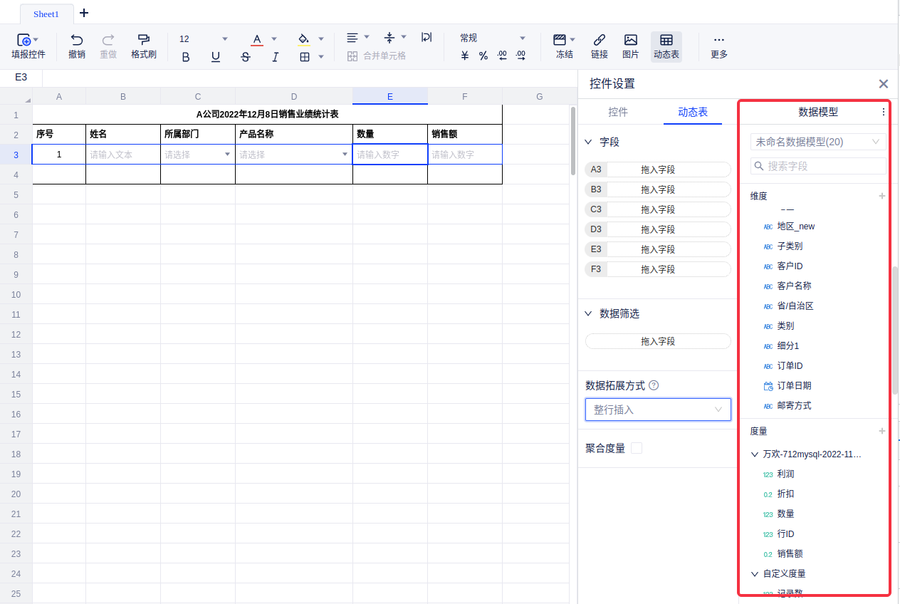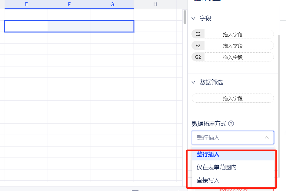 (1)动态表的数据拓展方式有三种:整行插入、仅在表单范围内和直接写入。整行插入会破坏表单已有的结构,仅在表单范围内插入则不会破坏表单已有的结构,直接写入则不允许删除和新增行,仅能在已有行中做数据修改