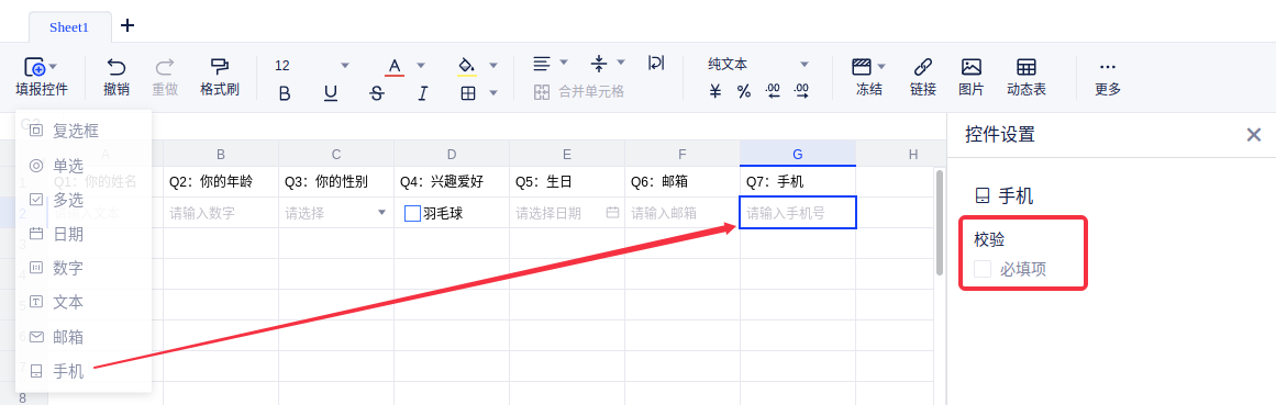 如果您需要搜集手机号类型的数据时可选用“手机”控件,可在控件设置处可以设置校验。