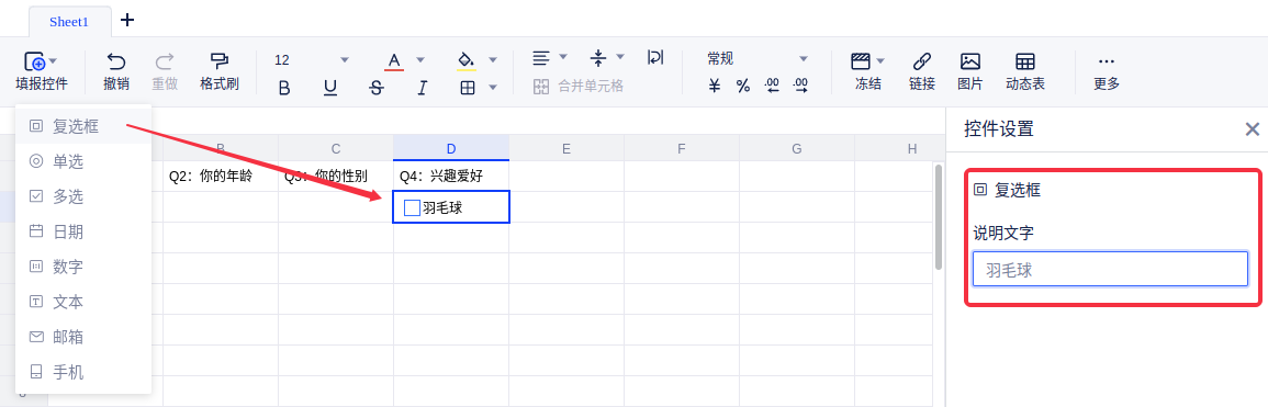 如果您需要配置多个选择类型的数据时选用“复选框”控件,然后在控件设置处可以配置说明文字来代表选项。