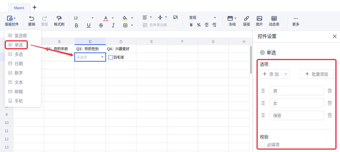 如果您需要收集选择类型的数据时可选用“单选”或“多选”控件,在控件设置处可以添加选项,并配置校验规则。