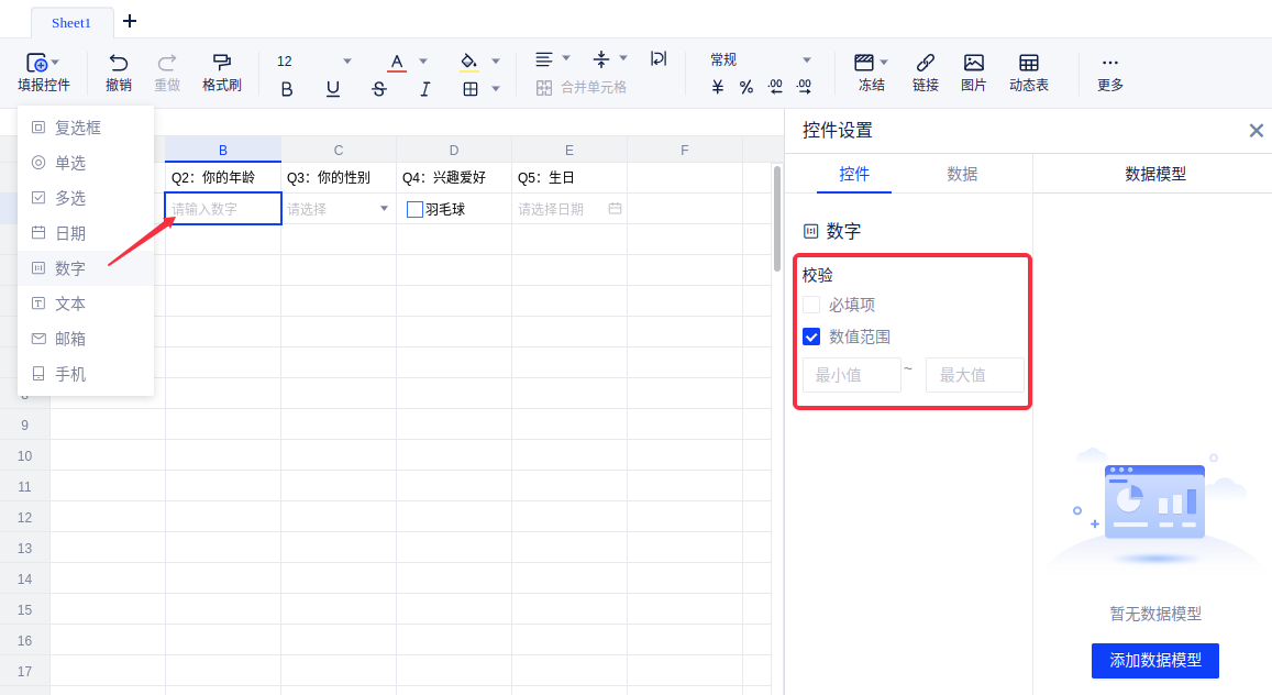 如果您需要搜集数字类型的数据时可选用“数字”控件,在控件设置处可以设置校验。