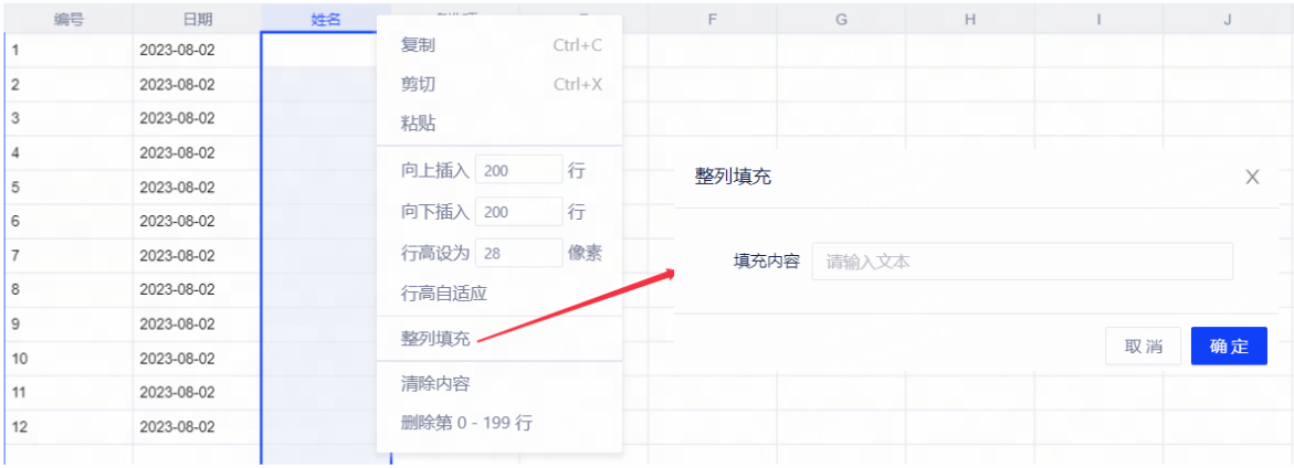 当鼠标悬浮在列标题上时,点击按钮出现下拉列表,您可以进行整列填充操作