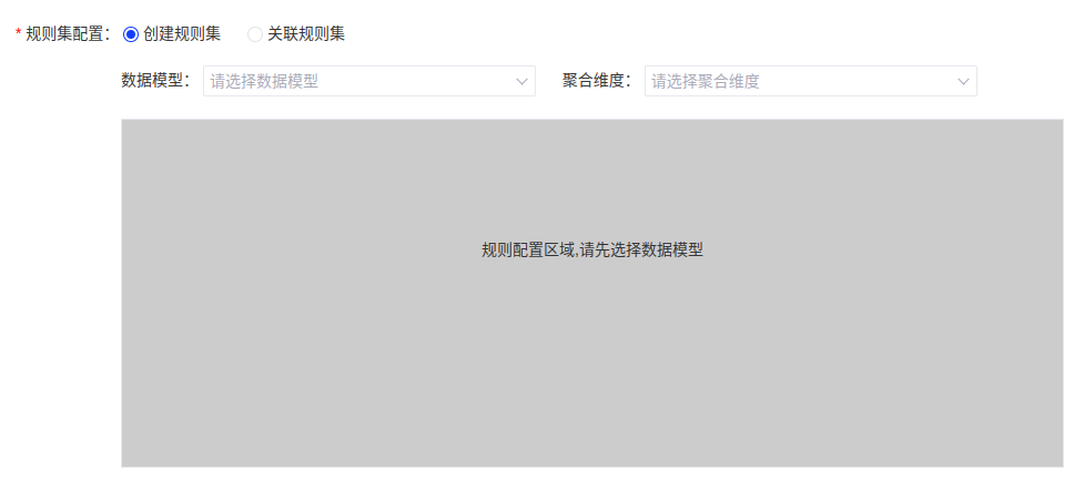 (3)规则集配置中,[创建规则集]需先选择数据模型,在选择对应的聚合维度,同时可在下方规则配置区进行维度字段的配置,进一步筛选;