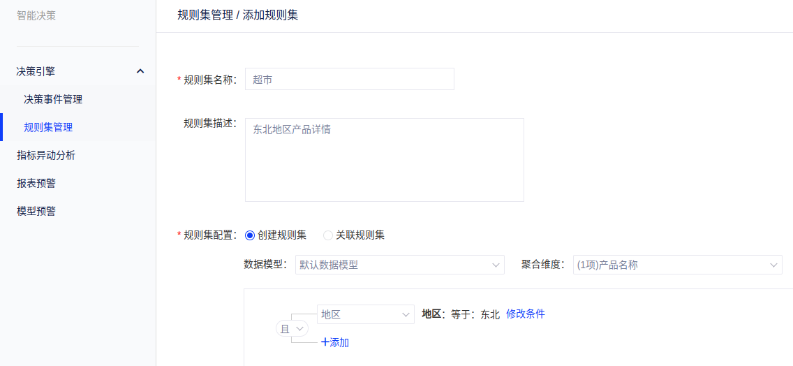 操作案例:想查看东北地区超市产品信息,首先创建一个规则,数据模型中选择超市,聚合维度为产品,选择东北地区,在决策事件管理中,触发该规则。具体设置如下: