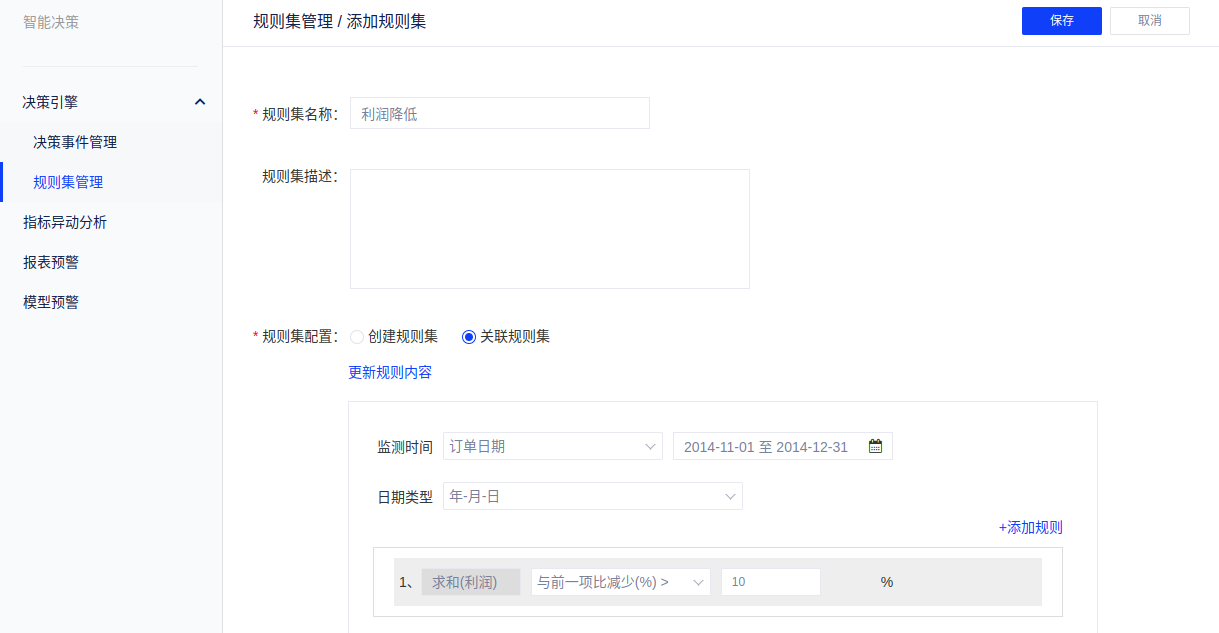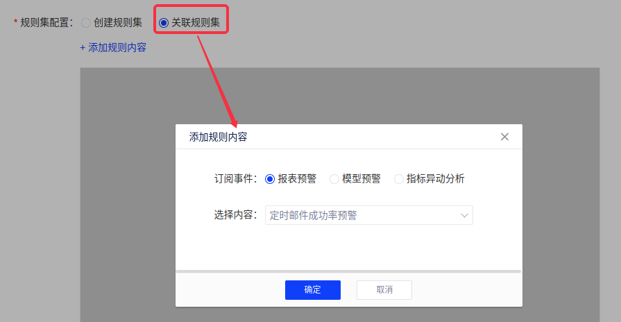 (4)规则集配置中,[关联规则集]可关联已经创建的度量预警或指标移动分析的规则,规则来源包括:报表预警、模型预警、指标异动分析;