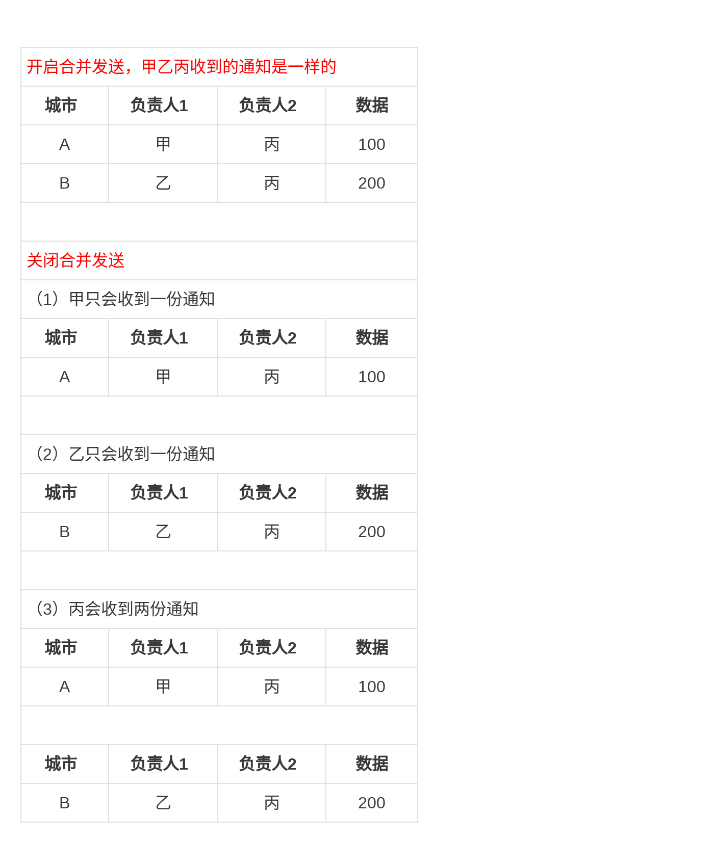 (4)合并发送开启(全部合并)和关闭(以接收人+抄送人为分组依据或仅以接收人为分组依据)时,附加内容选择了“数据表格”,不同的接收人接收通知情况如下图示例
