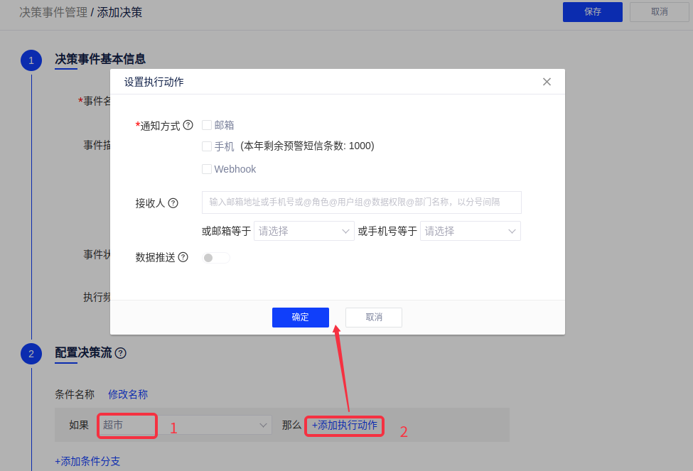 (1)在决策事件管理列表添加一条决策事件,然后依次设置事件名称、描述、状态、执行频率和配置决策流,在配置决策流环节点击[添加执行动作];