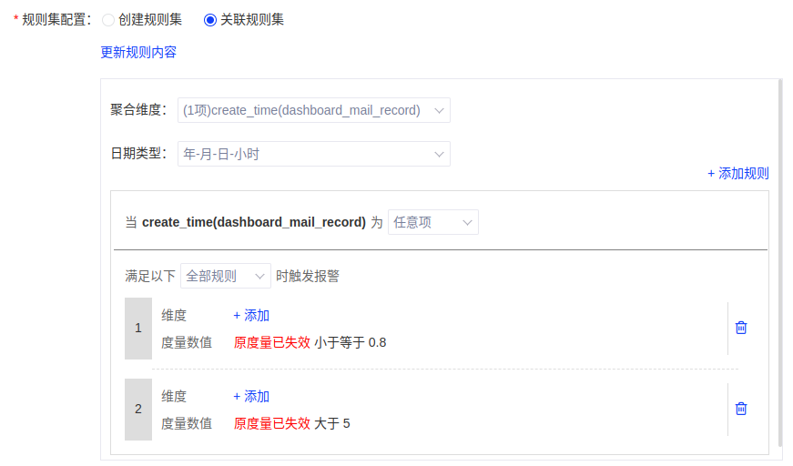 (5)然后点击[添加/更新规则内容]选择具体规则,包括聚合维度、规则列表。